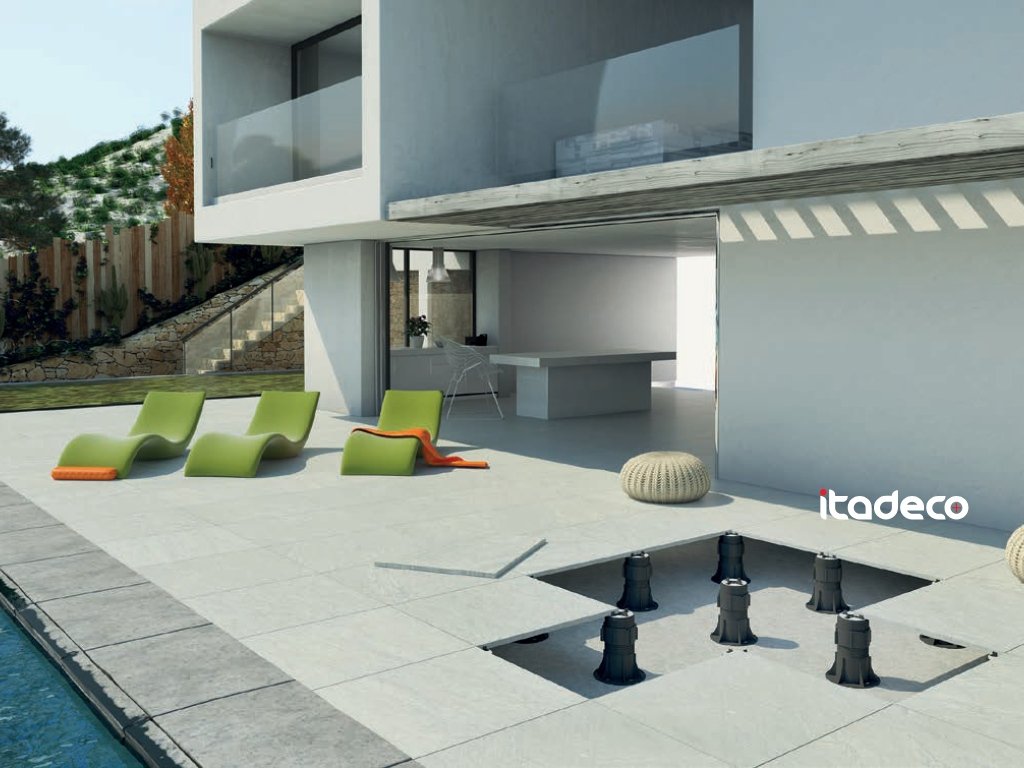 Možnost výškově nastavit každou podložku nezávisle regulačním klíčem i potom, co je dlažba již položena, Vám umožní dosáhnout dokonale rovné terasy.