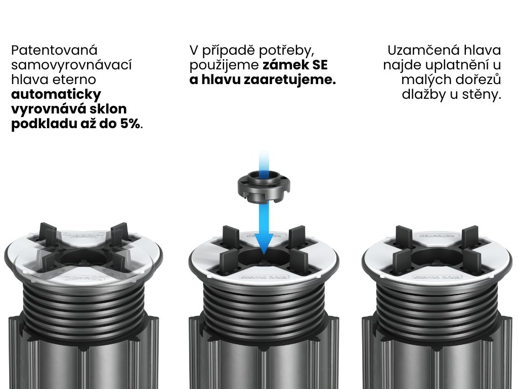 Unikátní patentovaná konstrukce výkyvné hlavy SE, zajišťuje automatickou regulaci sklonu až do 5% spádu podkladové vrstvy. Toto řešení zrychluje instalaci terasy a šetří Váš čas.
