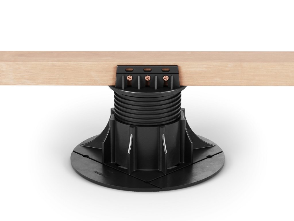 Unikátní patentovaná konstrukce výkyvné hlavy SE Wood, zajišťuje automatickou regulaci sklonu až do 5% spádu podkladové vrstvy. Toto řešení zrychluje instalaci terasy a šetří Váš čas.
