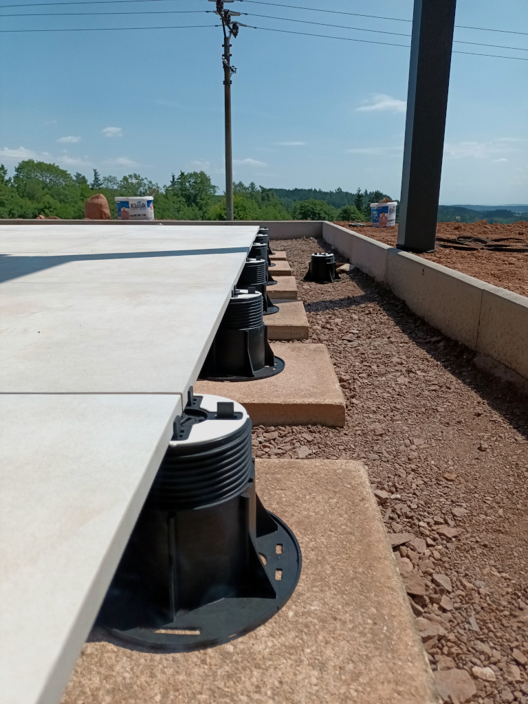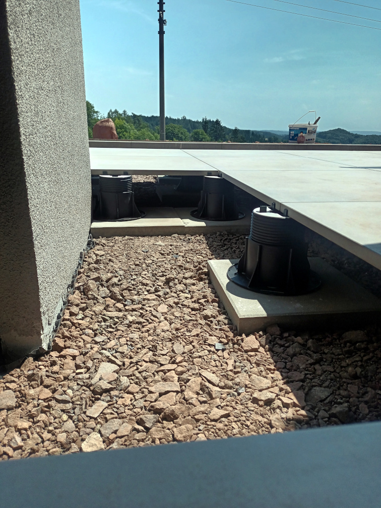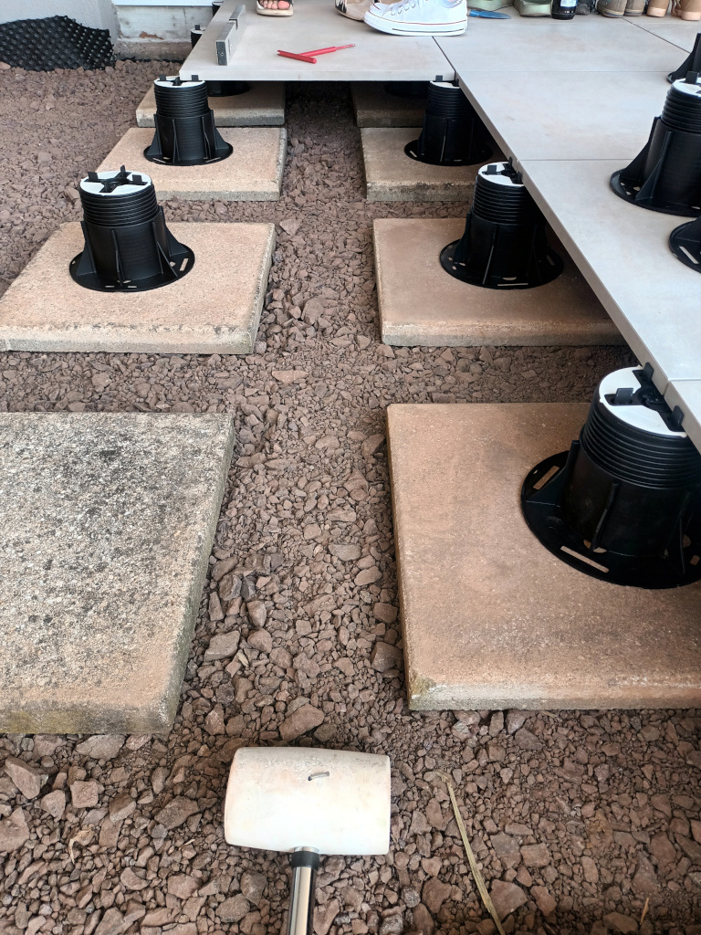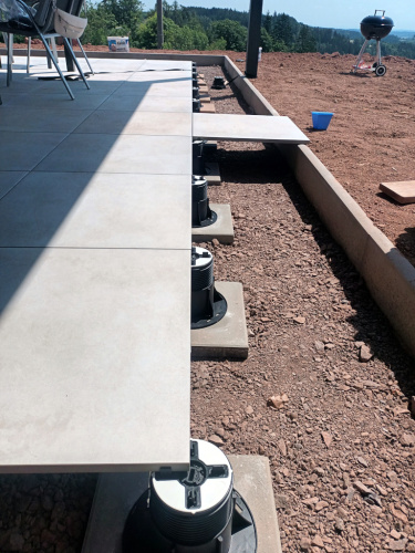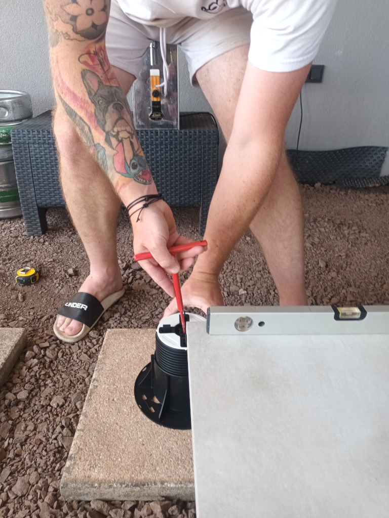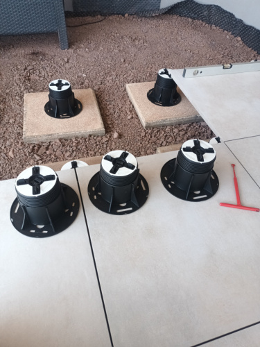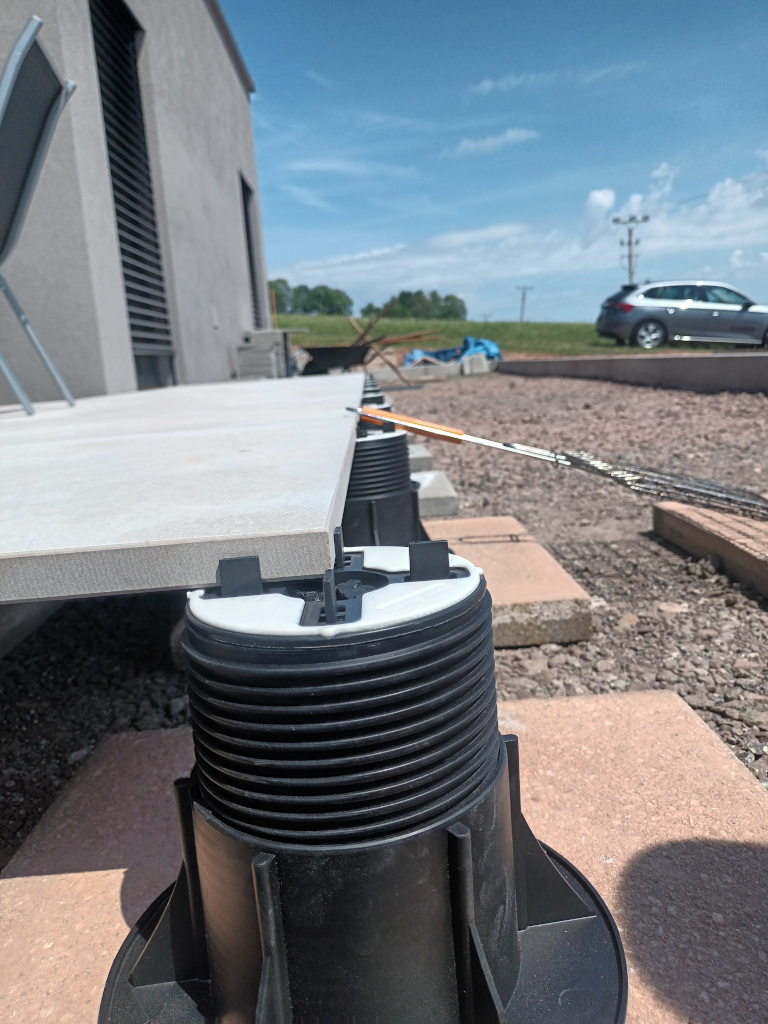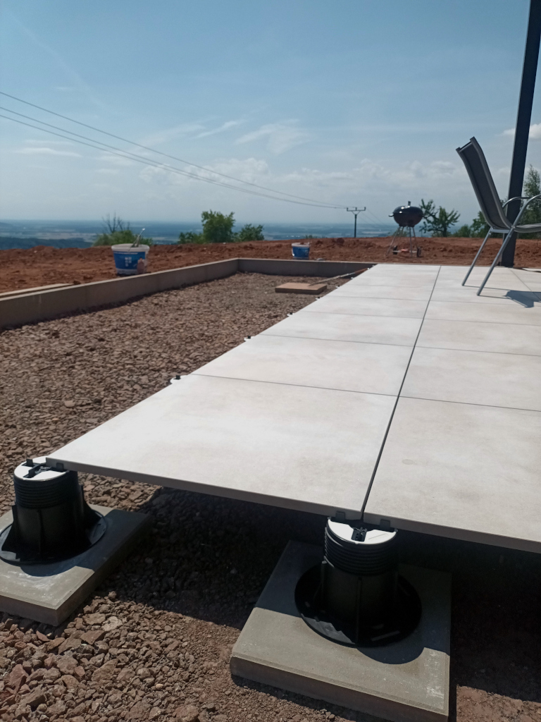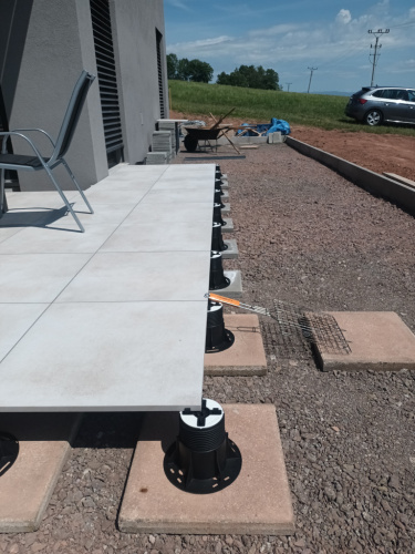 🔥Přinášíme vám fotografie terasy, kterou si zákazník pokládal na terasové terče NEW MAXI svépomocí 💪. Venkovní keramická dlažba ve světle šedém dekoru formátu 60 x 60 x 2 cm je v barevné harmonii s domem a jemně kontrastuje s tmavší fasádou. Terče stojí na starších betonových dlaždicích, které jsou kladeny na štěrk. Nepostradatelným nástrojem pro perfektní doladění výšky terčů je červený regulační klíč ETERNO. Ten lze vyžít, pokud zvolíte terče s šířkou spáry 4 mm. S pomocí klíče můžete přesně nastavovat výšku i na hotové pokládce.