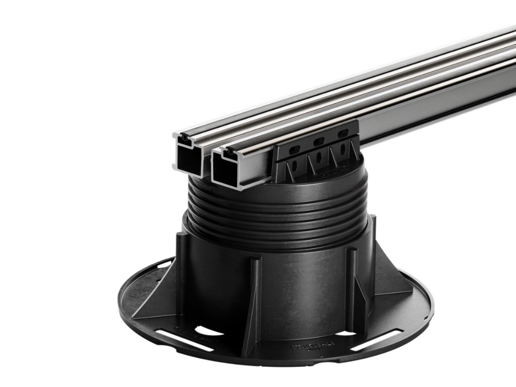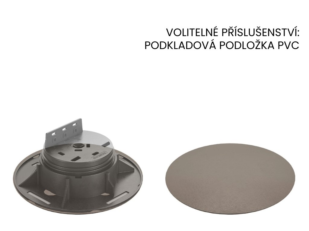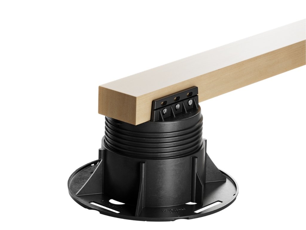 Hlava podložky je spojena se závitem a je opatřena opěrnou destičkou pro snadné připevnění všech typů terasových nosníků (hliník, dřevo nebo WPC - dřevoplast). Boční připevnění k terasovému nosníku vrutem, umožňuje regulaci výšky podložky i po spojení podložky s nosníkem nebo roštem.