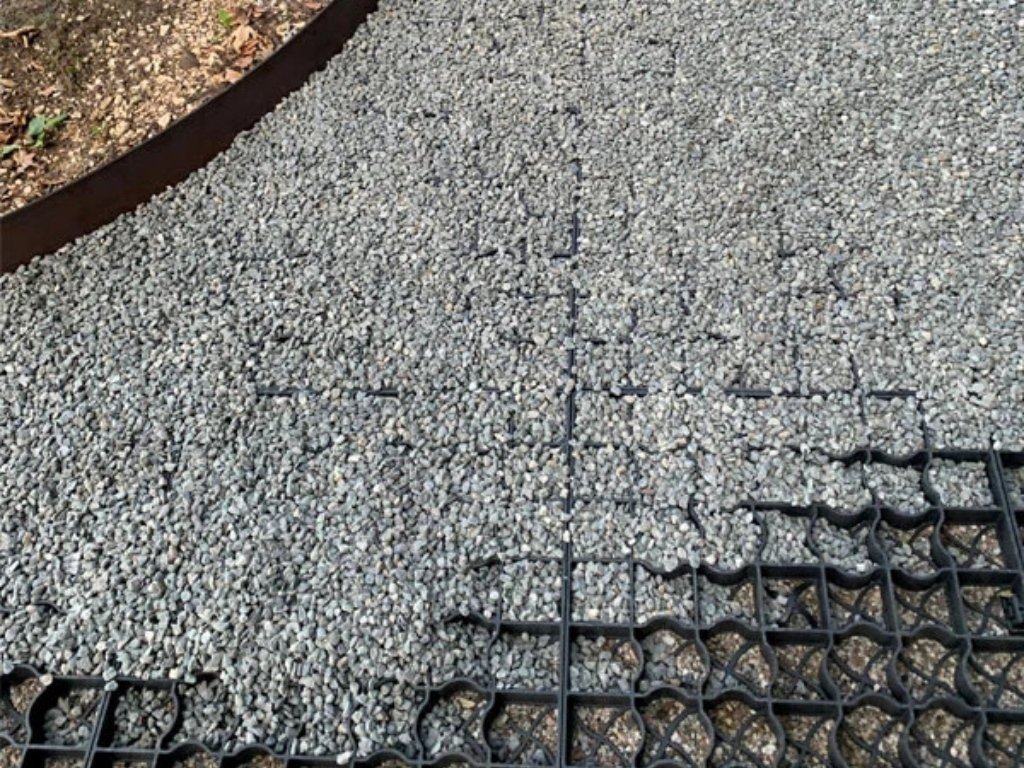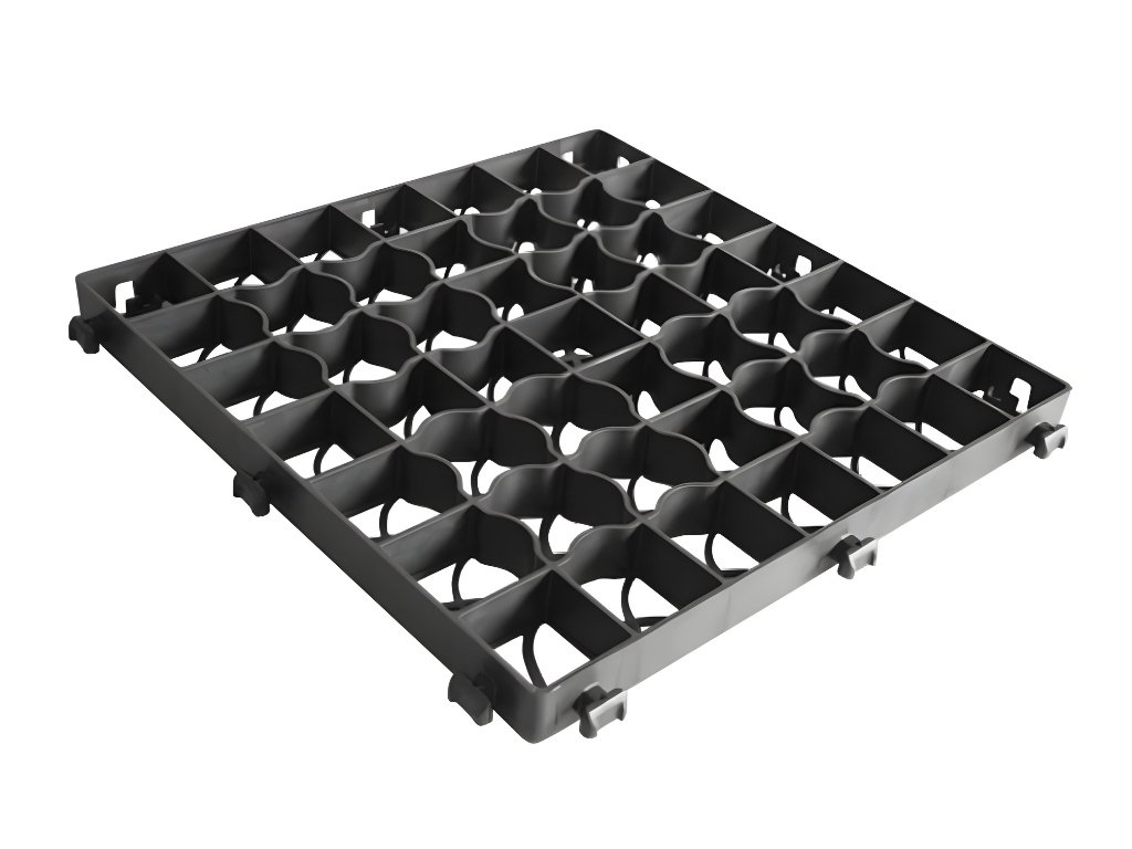 umožňuje spojovat panely a vytvářet souvislou plochu, která se po zasypání štěrkem nebo trávou stává zcela neviditelnou a zachovává přirozený